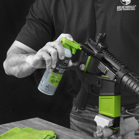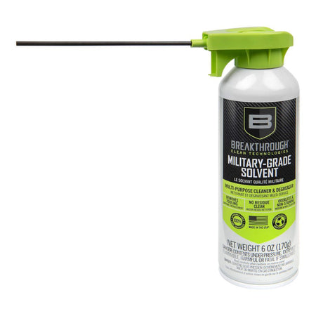 Our Breakthrough® Clean Aerosol Military-Grade Solvent is our best-selling item, now available in aerosol! The Aerosol Series is our newest addition to our full line of gun cleaning supplies and equipment to give you more control over your cleaning. Aerosols are designed to be more user-friendly, allowing the user to have a more accurate application of the chemicals. The Aerosol Military-Grade Solvent is a multi-purpose cleaner and degreaser that helps remove oil, grease, and carbon build-up, giving you a no residue clean. Our various sized aerosol bottles are a fast maintenance solution for removing carbon build up, and it leaves no residue behind. Unlike other aromatic cleaners, our odorless formula allows you to clean indoors without having to deal with noxious and unpleasant fumes. Our premium gun solvent cleaner, along with our gun oils, will help keep your guns in peak condition and top-notch performance. It has low vapor pressure and will not freeze when you pack it away with your firearm accessories. The Breakthrough® Clean Aerosol Military-Grade Solvent is odorless, safe to use, and is made in the USA.