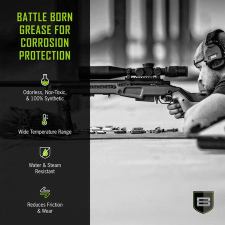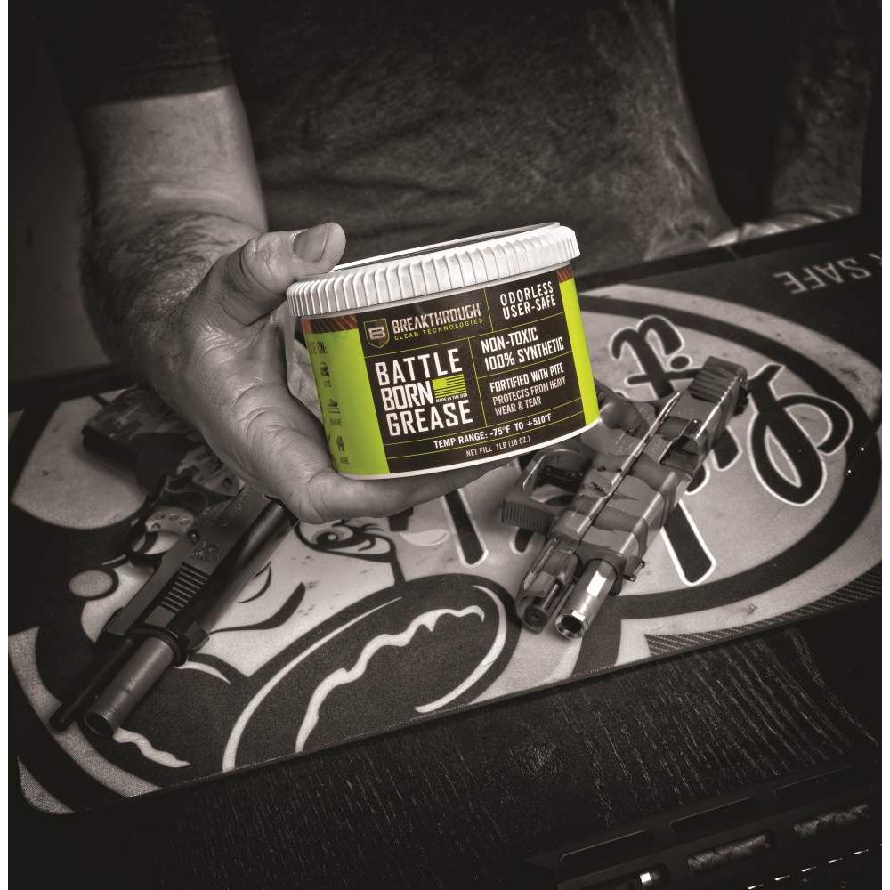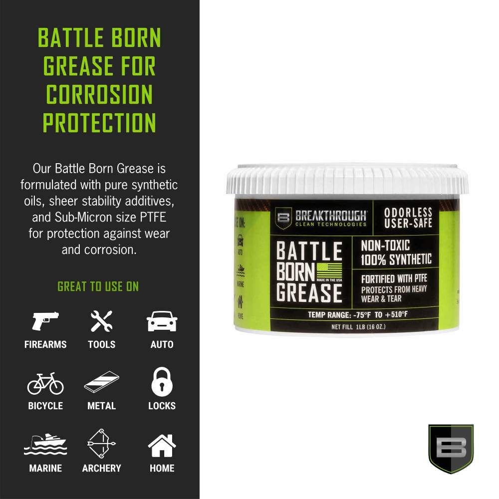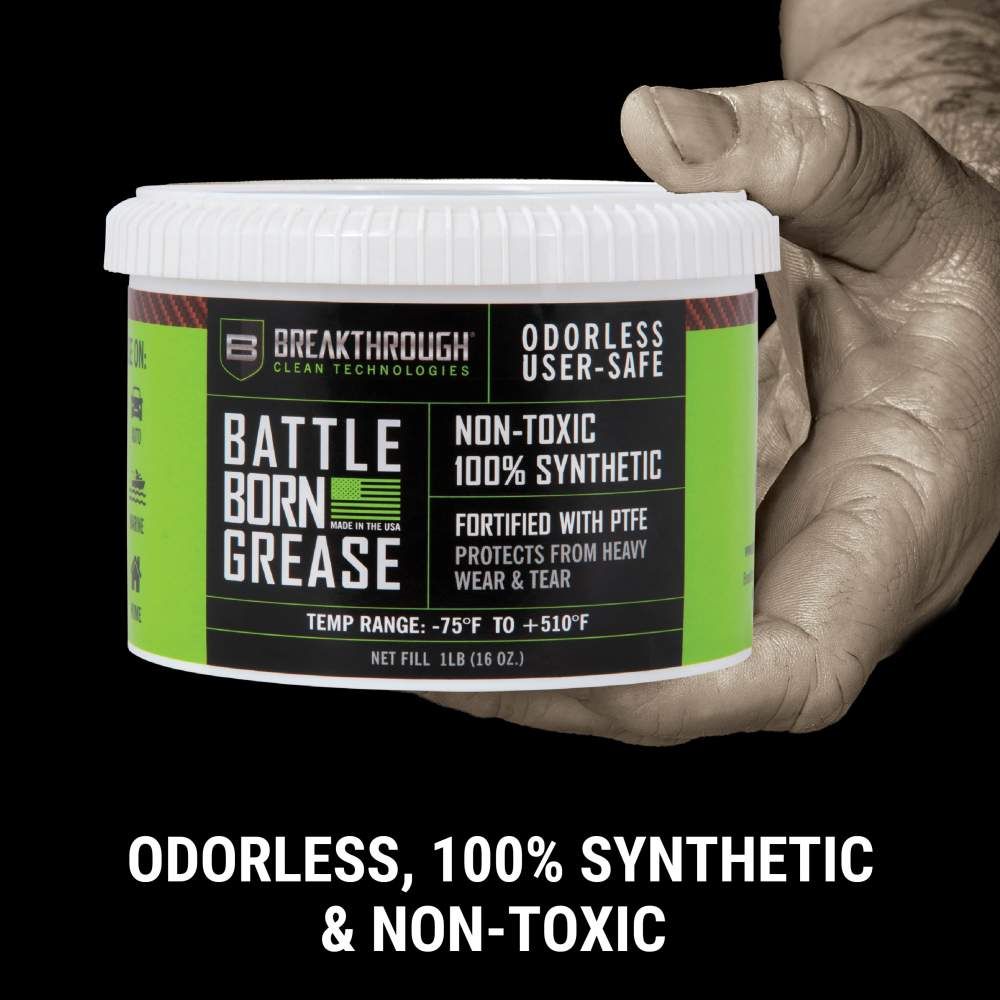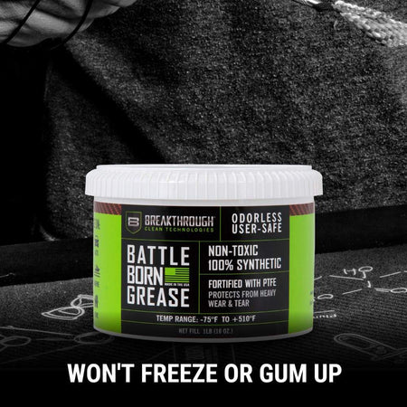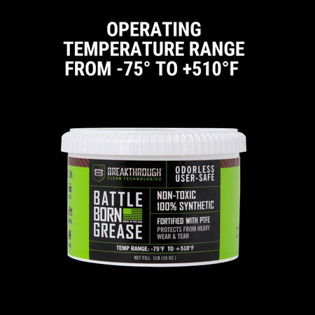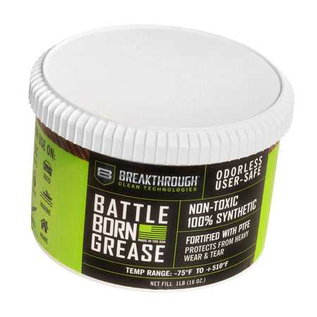 The Breakthrough Clean Technologies® Battle Born Grease is designed to be the highest quality, most advanced, lubricant available on the market. Our firearm grease is formulated with pure synthetic oils, shear stability additives and Sub-Micron size PTFE to protect against wear and corrosion from friction and moisture while withstanding a broad range of temperatures. (Operating Range -75° to +510°F).