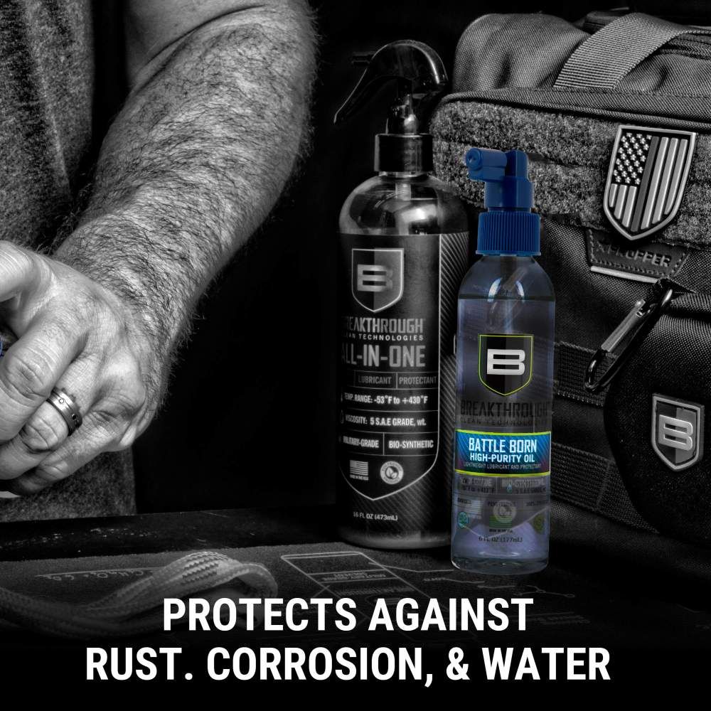 The Breakthrough Clean Technologies® Battle Born High-Purity Oil, is a general-purpose low-viscosity oil that is a lighter version of our bestselling HP Pro Oil, is a blend of high-quality, 100% synthetic gun cleaning oils. This non-toxic, odorless lubricant is treated with the highest quality anti-rust, anti-foam, and anti-wear additives to provide ultimate and lasting corrosion protection and lubrication under extreme pressure and a broad temperature range (from -90°F to 417°F).
