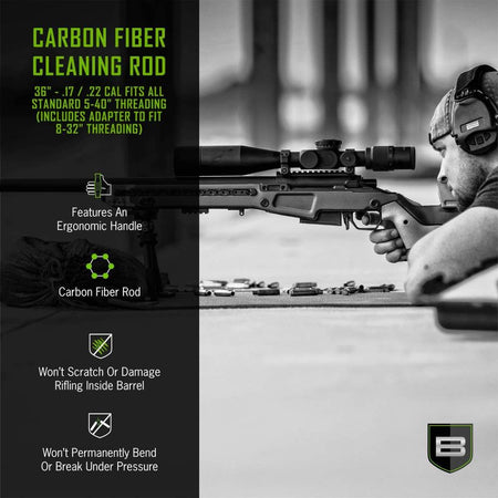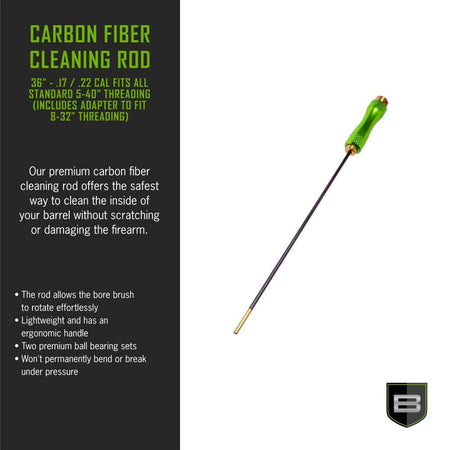 Our premium Breakthrough Clean Technologies® Carbon Fiber Cleaning Rods offer the safest way to clean the inside of your barrel. Featuring our Smooth Operator™ ergonomic handle and two premium ball bearing sets, the rod can smoothly migrate through the bore of your barrel without binding up under pressure. Its carbon fiber rod offers you the security of knowing you’ll never have to worry about scratching or damaging the rifling inside the barrel of your firearm. It’s lightweight yet durable carbon fiber construction is long lasting and won’t permanently bend or break under pressure.