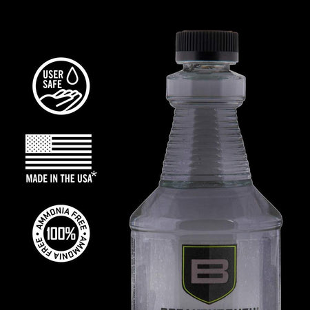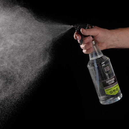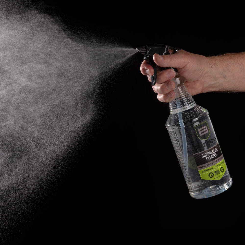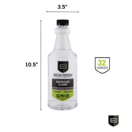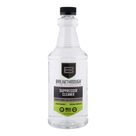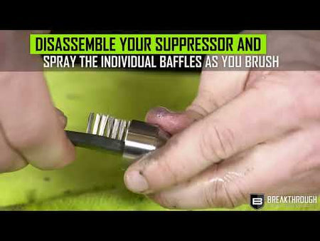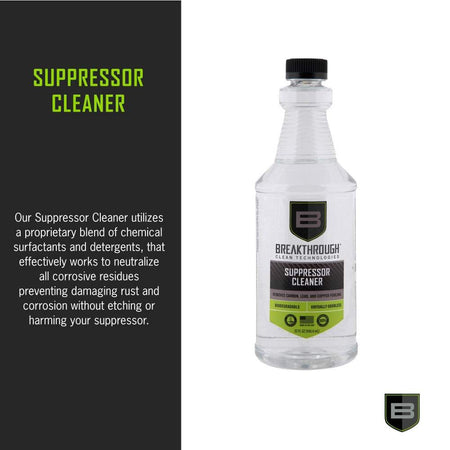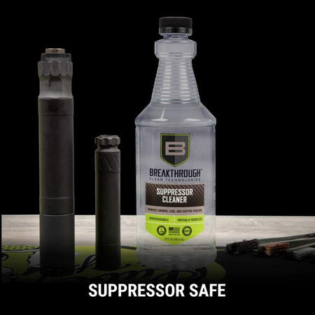 The Breakthrough Clean Technologies® Suppressor Cleaner is a water-based, ammonia-free, cleaner that removes heavy carbon and lead deposits. Utilizing a proprietary blend of chemical surfactants and detergents, Suppressor Cleaner effectively works to neutralize all corrosive residues preventing damaging rust and corrosion without etching or harming your suppressor. With no noxious fumes or hazardous chemicals, Suppressor Cleaner is a safe and effective choice when it comes to removing stubborn carbon & lead build-up in your suppressor. There are a variety of ways to clean a suppressor based on the construction. Some suppressors can be disassembled, but many cannot. Breakthrough Clean Technologies® Suppressor Cleaner has been refined using modern chemistry to tackle this difficult task. It has been rigorously tested by Breakthrough Clean Technologies® and suppressor manufacturers with impressive results. The recommended cleaning process is submersion in the Suppressor Cleaner. The duration needed depends on the cleanliness of the suppressor. If you are cleaning on a regular schedule that coincides with the cleaning of the firearm, it could be leaving the suppressor in the cleaner for as little as one hour. However, if cleaning the suppressor after multiple significant shooting sessions, it may require soaking for 8-12 hours to get the caked on contaminates to release. After soaking, shoot several rounds (supersonic is recommended) through the suppressor to eject the loosened fouling.