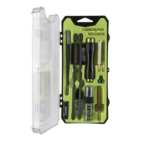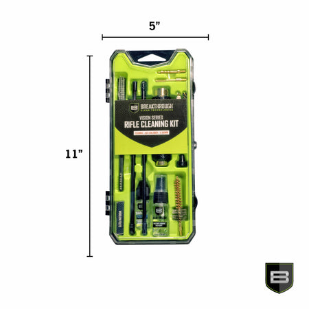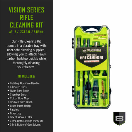 Our compact Breakthrough Clean Technologies® Vision Series™ AR-15 Cleaning Kit offers you everything you need to ensure a thorough clean. Its plastic tray keeps all the various pieces of the kit organized neatly inside a durable case that acts like a mini toolbox. This AR-15 cleaning kit comes with cleaning rod sections, various hard bristle nylon brushes, jags, patch holders, and cotton patches. Also included is our durable and detachable aluminum handle with knurling for an easy grip and our mini bottles of Breakthrough® Military-Grade Solvent and Battle Born High-Purity Oil. All of the rifle cleaning tools and supplies you need to keep your gun clean and functioning properly!