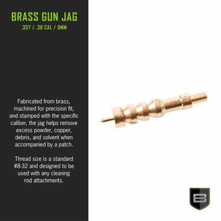 • GUN CLEANING TOOL: This .357 / .38 Cal / 9mm jag is fabricated from brass, is machined for precision fit & is stamped with the specific caliber. Thread size is a standard #8-32 & is designed to be used with any cleaning rods.