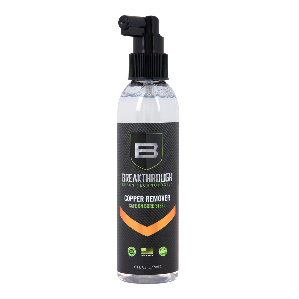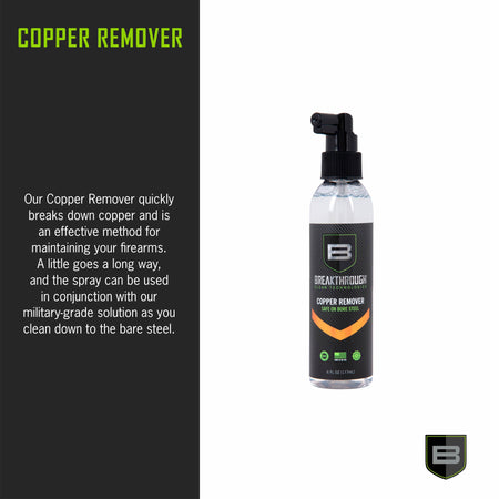 The Breakthrough Clean Technologies® Copper Remover safely and effectively removes copper fouling and is 100% petroleum and ammonia free. It’s virtually odorless and biodegradable formula easily removes copper fouling and minimizes future copper build up without giving off any harmful or strong offensive odors found in other copper removers. Usable on all types of bore steel and won’t etch or harm the barrel.