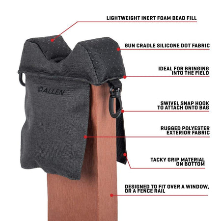 The Allen Company Eliminator Window Mount Gun Rest can be setup almost anywhere, at any time. The shooting rest is constructed of a poly inert foam bead fill that is easily portable with its lightweight construction. Designed for ultimate convenience, the gun rest features a swivel snap hook to attach onto a bag and weighs approximately 0.17 lbs. The gun cradle is designed with a silicone dot fabric and a tacky grip material on the bottom of the rest to provide extra resistance, ensuring your gun rests steady in place. Made of a rugged polyester exterior fabric, this gun rest remains highly durable and can withstand severe weather conditions when you're out on the field. The Allen Company Eliminator Window Mount Gun Rest is designed to fit over a window or a fence rail.