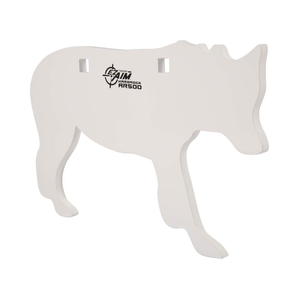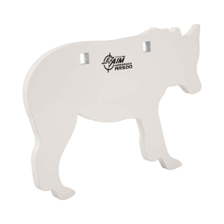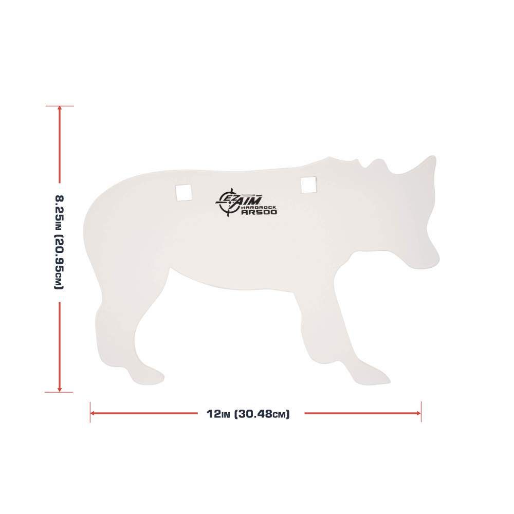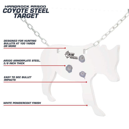 The EZ Aim® AR500 Coyote Target is designed for use with hunting caliber guns shooting hunting bullets at 100 yards or more. The 3/8 thick Armor Plate steel is designed for ragged use. The gong hanger attachment points are well inside the body to limit failure if hit by a bullet. The white powder-coat finish makes it easy to see bullet impact point. Dimensions: 12 x 8.25 x 3/8 inch.