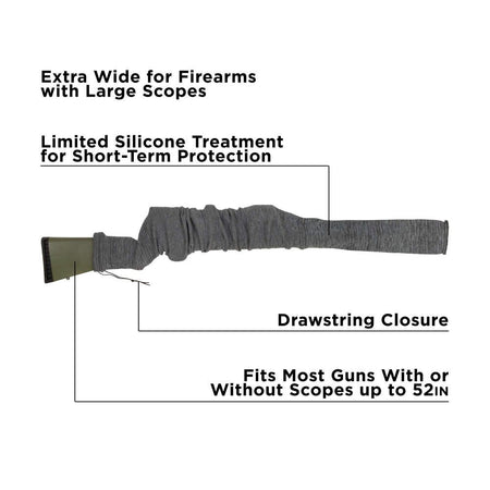 This Long Gun Sock by Allen comes in a black and gray color fabric and is extra wide for firearms with large scopes, including firearms with extra tall scope mounting. The Limited silicone treatment for short-term protection is designed to prevent your firearm from rust and debris, this gun sock also prevents dings and scratches when stored in your safe or hard case. Made to fit firearms up to 50-inches in length and 4-inches wide.