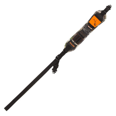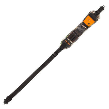 The Hypa-Lite™ Bull Stalker™ Rifle Sling is designed with the Elk Hunter in mind. Constructed with ultra-durable and lightweight Hypalon and molded with low-density foam and features a non-slip backing. The front of the sling features Mossy Oak® Mountain Country® camo with blaze orange accents in quiet fabric and engineered with stretch mesh pockets for your windicator and diaphragm calls, plus three spare cartridge loops. The body of the shoulder pad is 14-inches long by 3.25-inches wide, and the adjustable web sling is 1-inch wide. Includes D-rings to attach accessories and an adjustable ladder lock buckle and Swivels tested to hold up to 500 pounds.