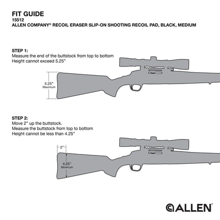 The Allen Company Recoil Eraser is perfect for people who don't want to wear a shooting vest while hunting or at the gun range. It reduces felt recoil by up to 70%. This recoil-reducing pad is easy to install and uses the latest high-tech recoil-reducing polymer to ensure long-lasting use. It fits most shotguns and rifles with straight stocks. --- Known Fits/Small: BAIKAL: Some - BROWNING: A-Bolt, A-Bold Medallion (most), A-Bolt New Short Mag, BLR Model 81 - H&R: SB2-998 Slug Hunter, ITHACA: Storm (most), MARLIN: 444, 450, 336, 512 (most) MOSSBERG: 500 AG Turkey 12ga, 500 Bantam, 500 Youth, 9200 (most), 9300 (most) NEW ENGLAND ARMS: Handi-rifle, Handi-rifle youth, Parder, Parder Youth, Tracker II Slug PARKER HALE: 7mm mag (most) 870 Express, 870 Express Deer, 870 Express Super Mag REMINGTON: Combo, 870, 870 Express Turkey, 870 Police, 870 Wingmaster, 1187 SP 1992, Model 7, 700ADL/BDL (4-7/8" stock) RUGER: M77 Mark II Compact (Most) SAVAGE: Most THOMPSON CENTER: Thunder Hawk 50 cal TIKKA: Most WINCHESTER: 70 Carbine 30.06, 100 (most), 1300, 70 Class Shadow, 70 (most), 70STR Sporter (most), 94 Legacy - Ranger, 94 (most), 94 Trapper, Super X2 - Known Fits/Medium: BAIKAL - some models, BENELLI - Nova, M-1 Field 12ga (non tactical), Montifeltro 12ga, Sport 12ga, Super Black Eagle 12ga (non-tactical) - BERETTA: 5" stocks, - BROWNING: BAR Auto, Citori (most), Gold Auto, Gold Ultimate Turkey - CHARELS DALY: O.U., Empire Hunter 20ga, Vaimax 912 12ga - CVA: Wolf ML - FRANCHI: Alcoine 12 ga, Auto Comp. 12ga, Varimax 912 12ga - ITHACA: Model 37 (1970's and older) - MOSSBERG: 500 (Camo, blk, green) 835, 935 - REMINGTON: Model 700 ADL/BDL (4-15/16" stock) - RUGER: Mini 14, KRELZ 1236, ML, No. 1, M77 (most), Red Label ('79/'80) - SAVAGE: Most Models - STOEGER: Most 12ga Models - THOMPSON CENTER: Black Diamond, Encore, Omega ML - TIKKA: Tikka T3 Lite - VERONA: Verona 12ga - WeatherbyL SAS Shotgun, SAS Slug gun - WINCHESTER: 1400 (most), 670 (most), ML, Model 70, Model 70 Featherweight (most), Super X1 (most), Supreme Select Sporting Over/Under.