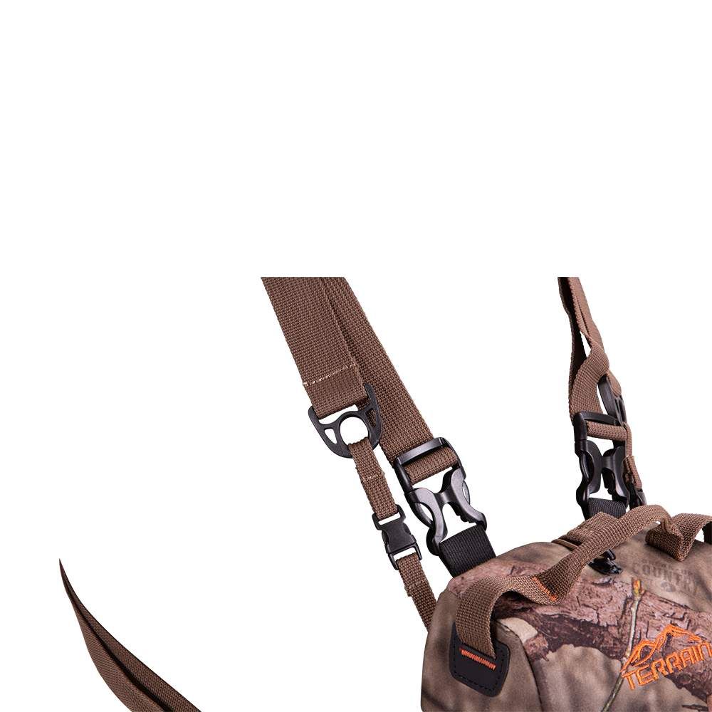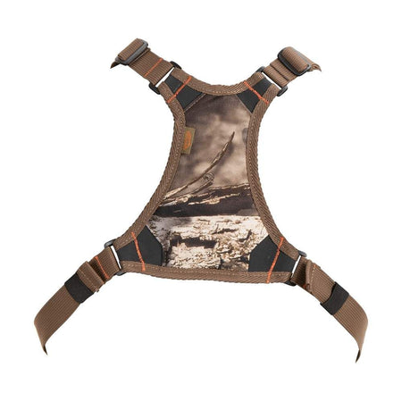 The Terrain™ Plateau Bino Case with Harness is an easy-open pouch and harness system designed to protect your binoculars and keep them right where you need them. The silent magnetic flap for the main compartment helps keep your movements quiet. When you are traversing over rough terrain you can buckle the top clip to make sure the flap stays closed. An adjustable strap around the body of the pouch helps keep your binoculars from moving around but also gives you an attachment point a range finder case or other accessories. The back harness is made from comfortable, breathable padded mesh and can be adjusted to fit most body types.