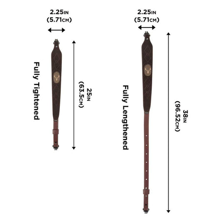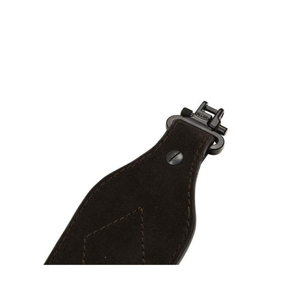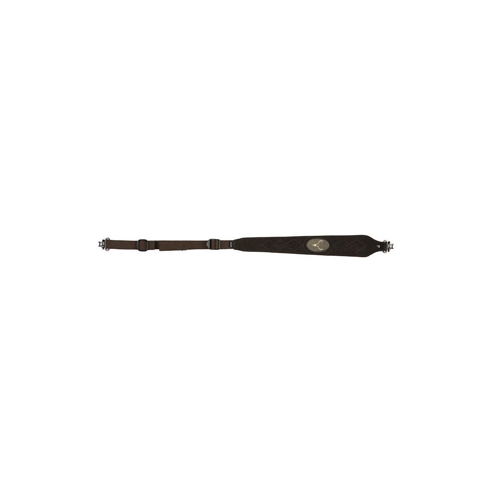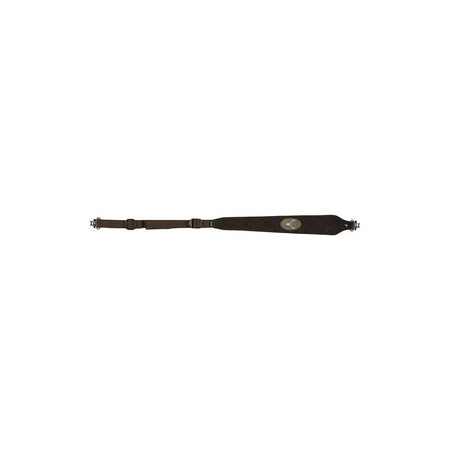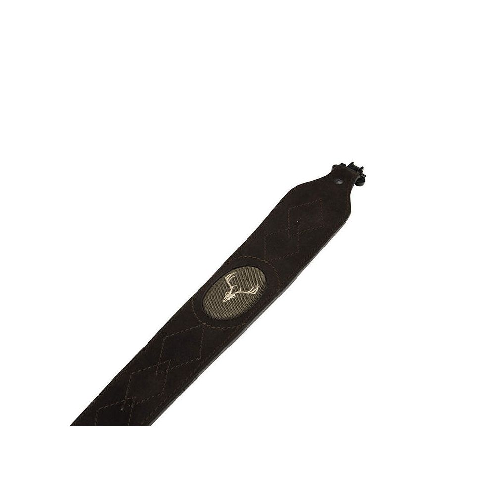 The Big Game Suede sling has a suede Leather face with decorative stitching framing an embroidered deer silhouette. The suede lining provides a non-slip grip on the shoulder. Swivels tested to 500 pounds.