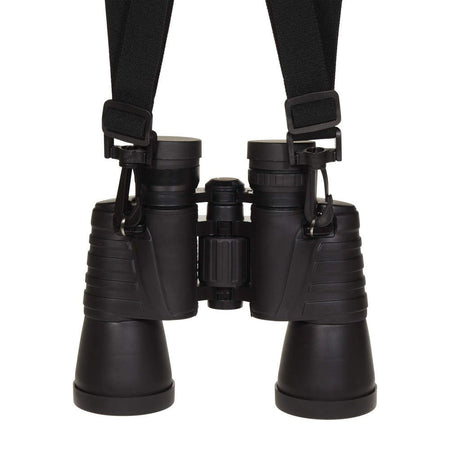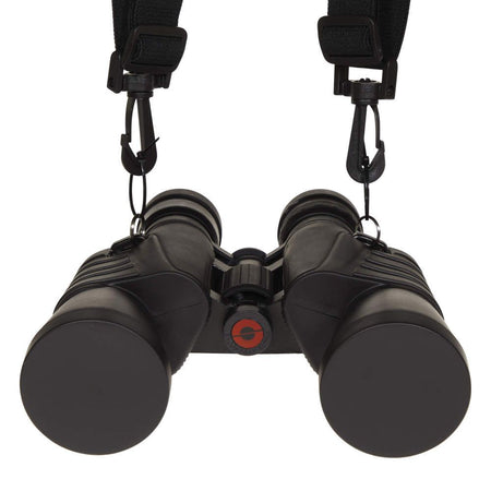 The Allen Binocular Strap is constructed of an elastic body harness that comfortably holds binoculars against your body to distribute the weight off your neck and free up your hands. Great for hunting, bird watching, and fishing, it also works for keeping cameras and other items close by. Easily attaches to most binoculars with quick ties, and the harness is adjustable to fit almost anyone. Includes an extra ring and ties to use with a second pair of binoculars.