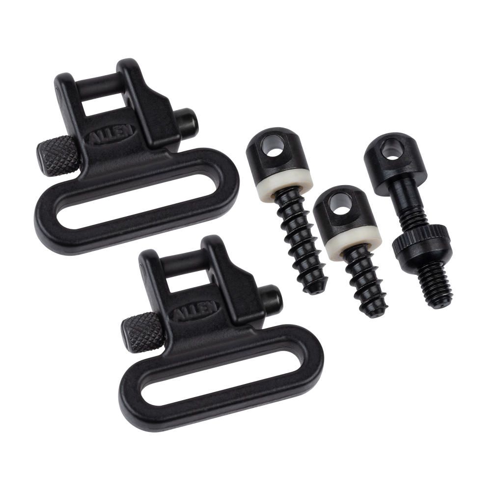 The Allen Magnum Swivel set is made for bolt action rifles without hardware installed, and fits Slings up to 1-inch wide. Contains hardware to install Swivels into most bolt action rifles. Designed to work with wood or synthetic stocks. Additional threaded screw and nut are included for a secure connection in stocks with thin wood walls or hollow synthetic stocks.